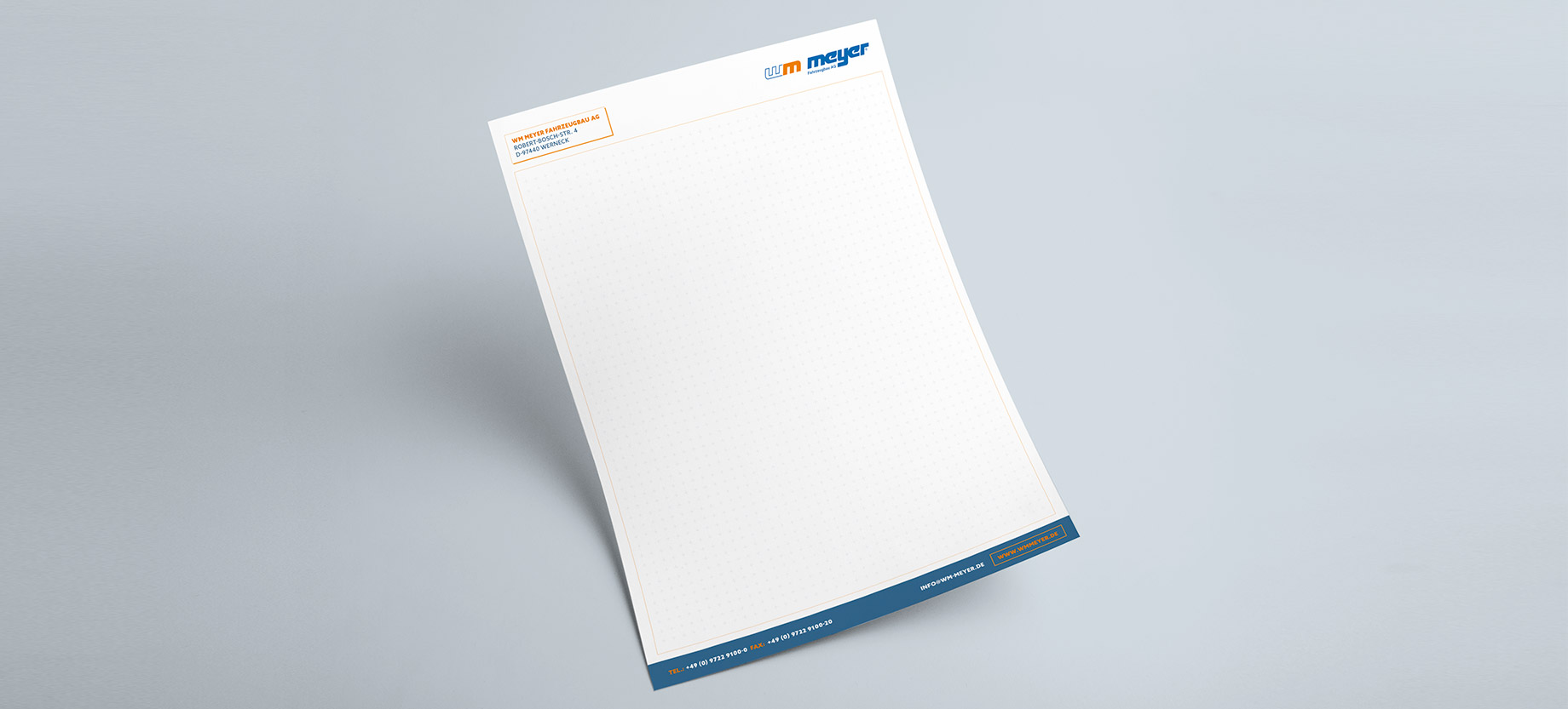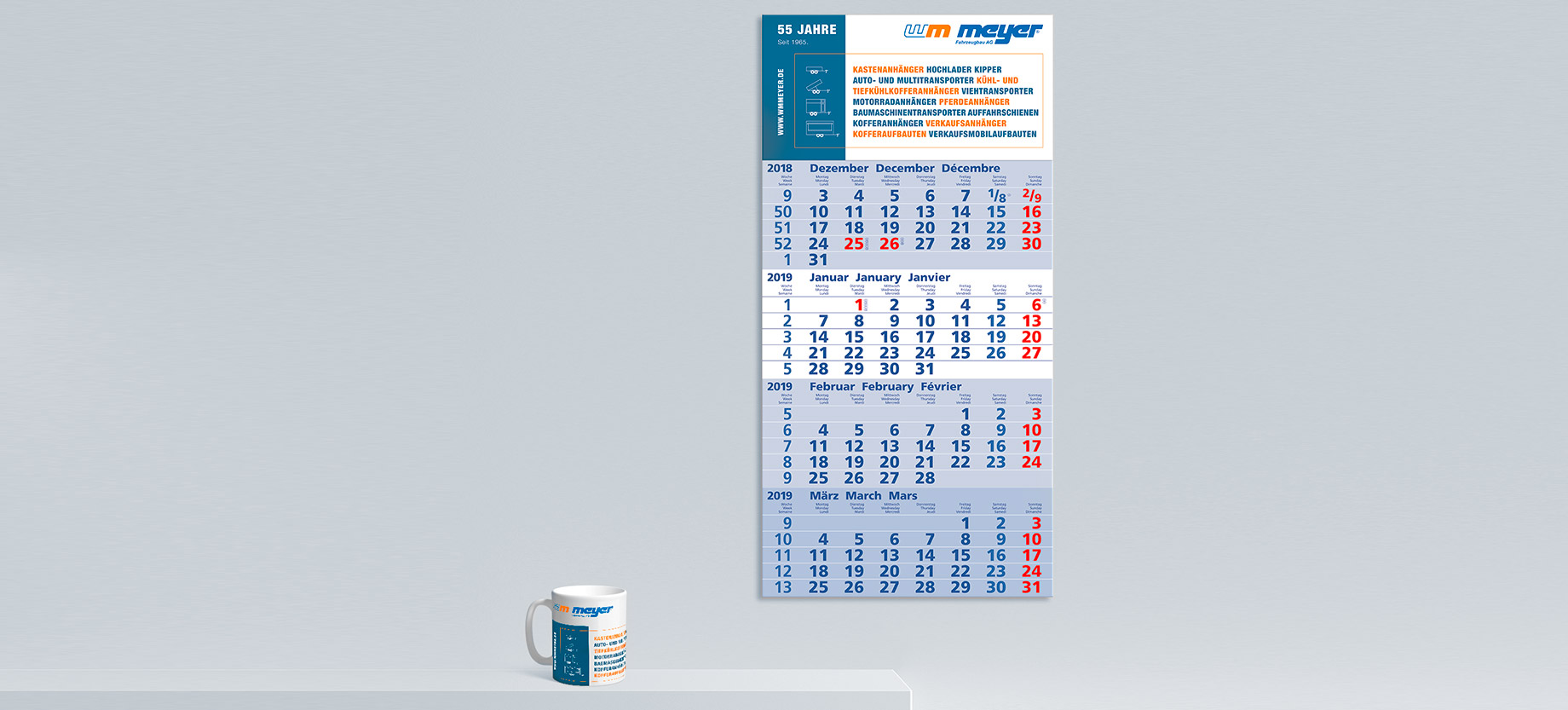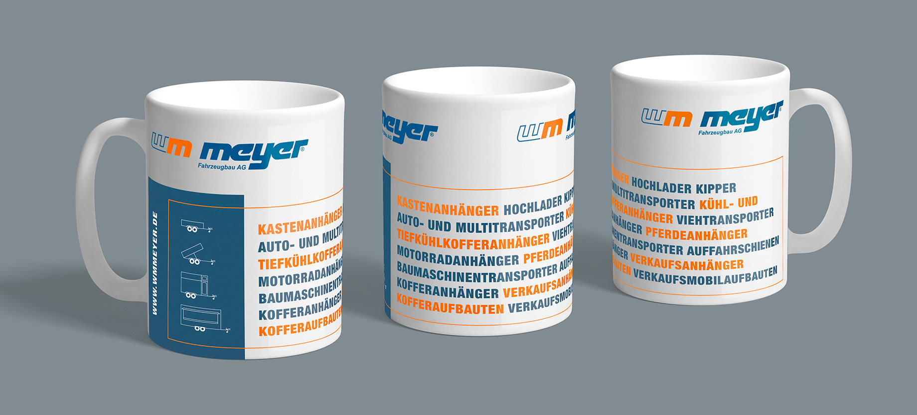 Gestaltung von Werbemitteln für die WM Meyer Fahrzeugbau AG aus Werneck. Tasse, Kalender,Schreibblock und Schreibtischunterlage – alles in einem aufgefrischten Design.